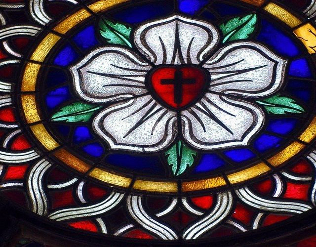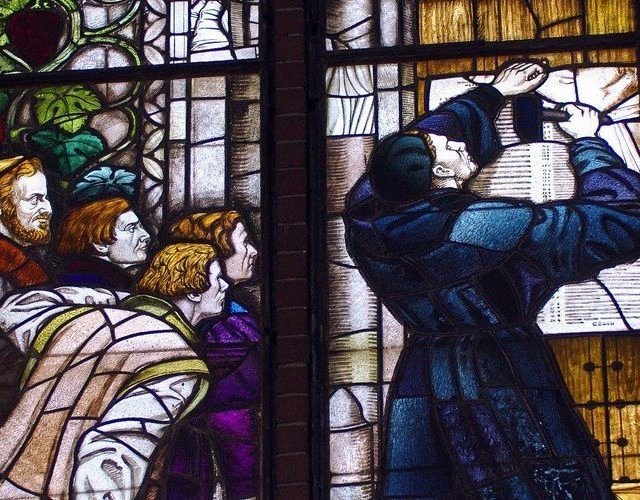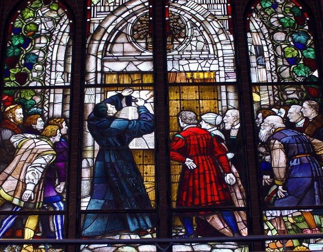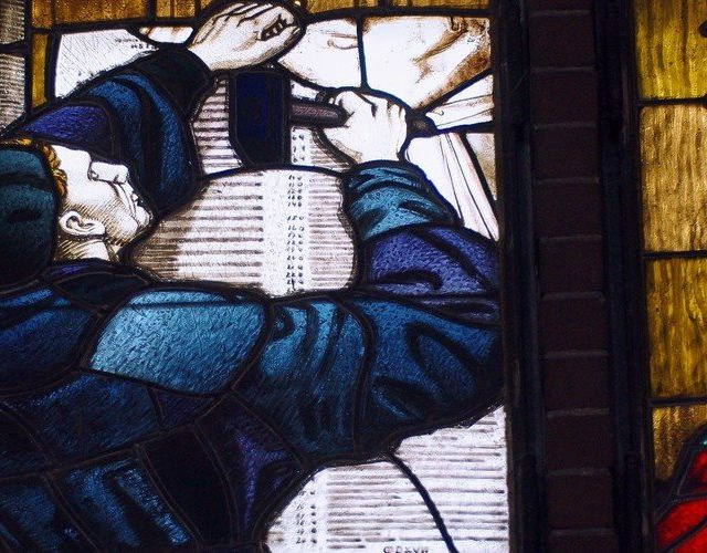 Das Fenster im Langschiff links wurde zum 400. Jahrestag von Luthers Thesenanschlag am 31. Oktober 1917 von der Gemeinde in Auftrag gegeben und beim 25. Kirchweihjubiläum, am 29. Dezember 1919, eingeweiht. Es wurde nach dem Entwurf eines Gemeindeglieds, Prof. Richard Böhlands, von den Gottfried Heinersdorff’schen Werkstätten für Mosaik und Glasmalerei in Treptow gestaltet und ist das letzte in der Reihe der alten Fenster; das gegenüber liegende Fenster blieb leer. Deutlich ist der Stilunterschied zu den älteren Fenstern, obwohl nur zwei Jahrzehnte dazwischen liegen. Während jene noch in der Tradition der Nazarener stehen, hat sich hier der Einfluss von Rudolf Schäfer voll durchgesetzt. Unter den Zeugen des Thesenanschlags befinden sich die drei damals amtierenden Pfarrer Julius Rodatz, Johannes Rauchstein und Max Braun (von der Mitte nach rechts gesehen). Den Sockel für die Szene vom Thesenanschlag bildeten die Symbole der vier Evangelisten, doch wurde der Engel des Matthäus nach oben versetzt, um dort eine Lücke zu schließen. Schnabel und Flügel des johanneischen Adlers erfüllen den gleichen Zweck im Areopagfenster. Das Vierpassfenster oben zeigt die Lutherrose, Luthers von ihm selbst entworfenes Wappen, Konzentrat seiner von Paulus übernommenen Kreuzestheologie und Echtheitssiegel seiner Schriften. Das neue Chorfenster aus den Jahren 1960/61, entworfen von dem Schöneberger Künstler Alfred Kothe, gestaltet in der Werkstatt von August Wagner, Berlin, zeigt noch einmal die Berufung des Apostels Paulus vor Damaskus. Es lohnt sich, beide Fenster miteinander zu vergleichen. Die Formensprache differiert, die Aussagen stimmen überein.