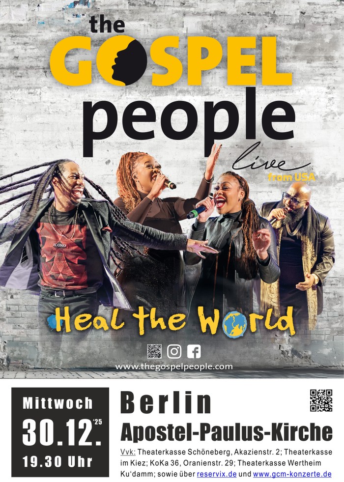 „Wenn Stimmen zu Herzen sprechen, Lieder Hoffnung schenken und jeder Ton ein kleines Gebet ist – dann sind The Gospel People nicht weit. Mit ihrer Tournee „Heal the World“ laden sie das Publikum ein zu einer Reise voller Emotion, Glauben und Lebensfreude. „Unsere Musik hat die Kraft, Herzen zu öffnen, Menschen zu verbinden und echte Veränderung anzustoßen, so Owen Nixon, Frontmann und Arrangeur der gefeierten US-Gospelgruppe The Gospel People. Mit ihrer mitreißenden Tournee bringen sie vom 12. Dezember 2025 bis zum 11. Januar 2026 pure Lebensfreude auf die Bühnen Europas! Auf dem Tourplan stehen rund 25 Konzerte in Deutschland, der Schweiz und Liechtenstein.